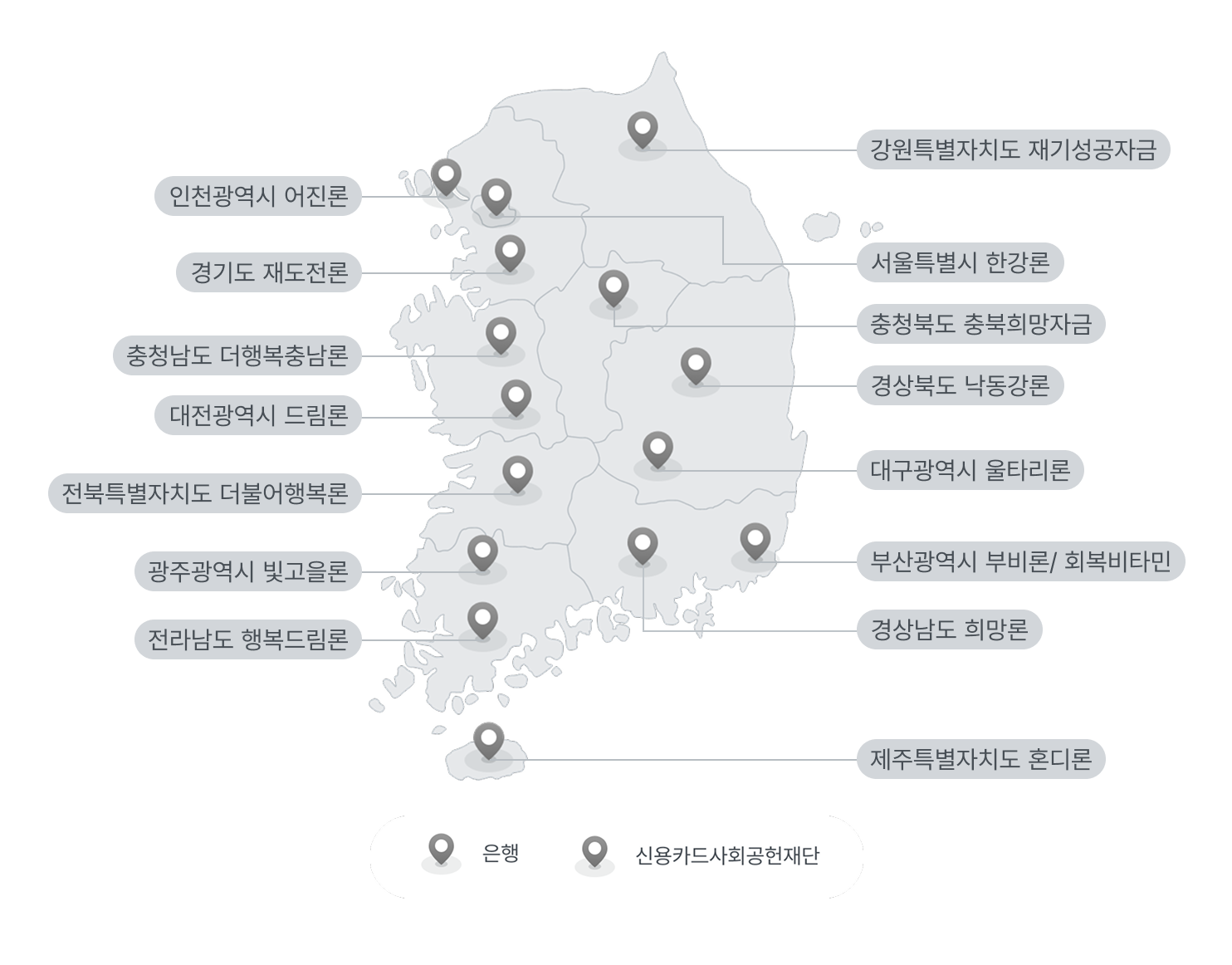 신용카드사회공헌재단으로부터 신용카드 영세가맹점주 및 신용카드 회원인 청년층들의 경제적 회생을 지원하고자 마련된 기금을 차입하여 신용회복지원 중인 분들에게 긴급 자금을 대출해드립니다.